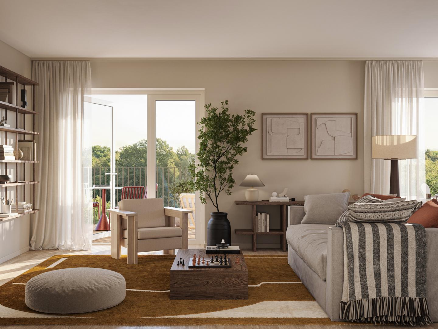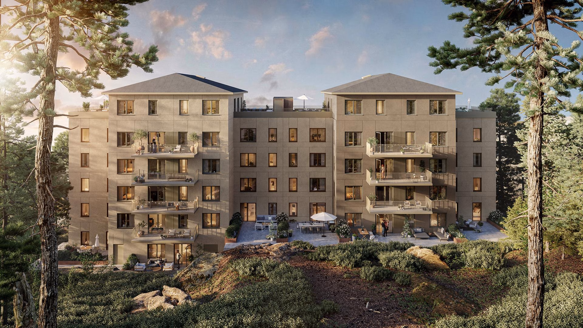 Interiören är inspirerad av naturen med ljusa väggar i varm grå/beige ton, mörkt ek-kök och askparkett. Hela bostaden har golvvärme, vilket ger hög komfort, ett stilrent uttryck och god möbleringsfrihet. Uppvärmning sker via energieffektiv bergvärme för ett hållbart och ekonomiskt boende.