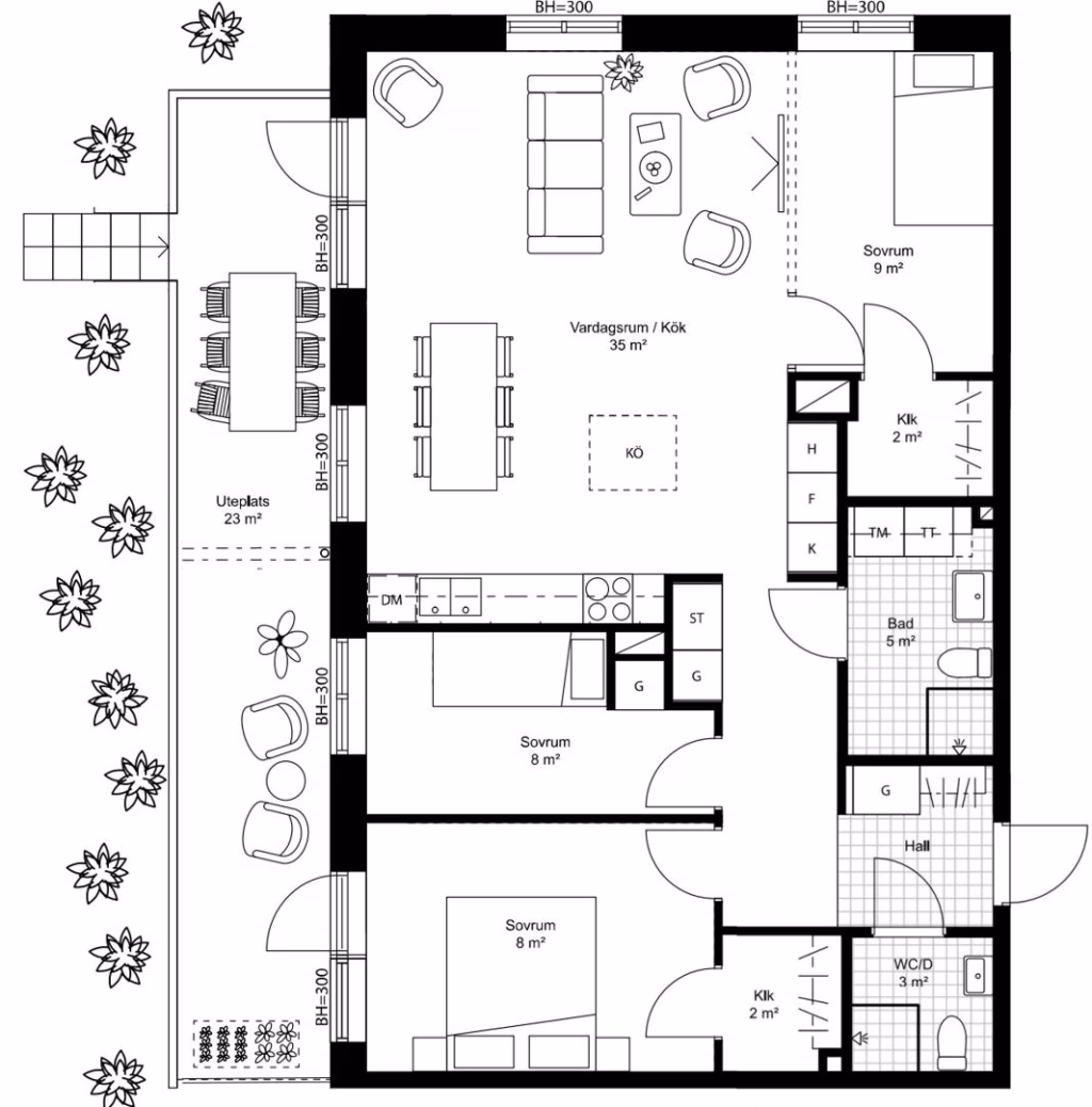 Bo optimalt med stor uteplats och fin utsikt mot golfbanans utslagsplats. Kök och vardagsrum har en öppen planlösning och för den som köper i tidigt skede finns möjlighet att skapa en större social yta genom att välja bort en vägg till angränsande sovrum. Lägenheten har två klädkammare varav den ena ligger i anslutning till stora sovrummet. Här finns även två badrum varav det ena är utrustat med tvättmaskin och tumlare.