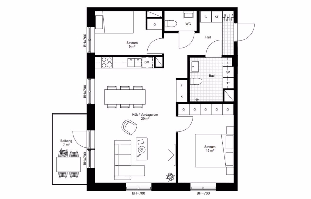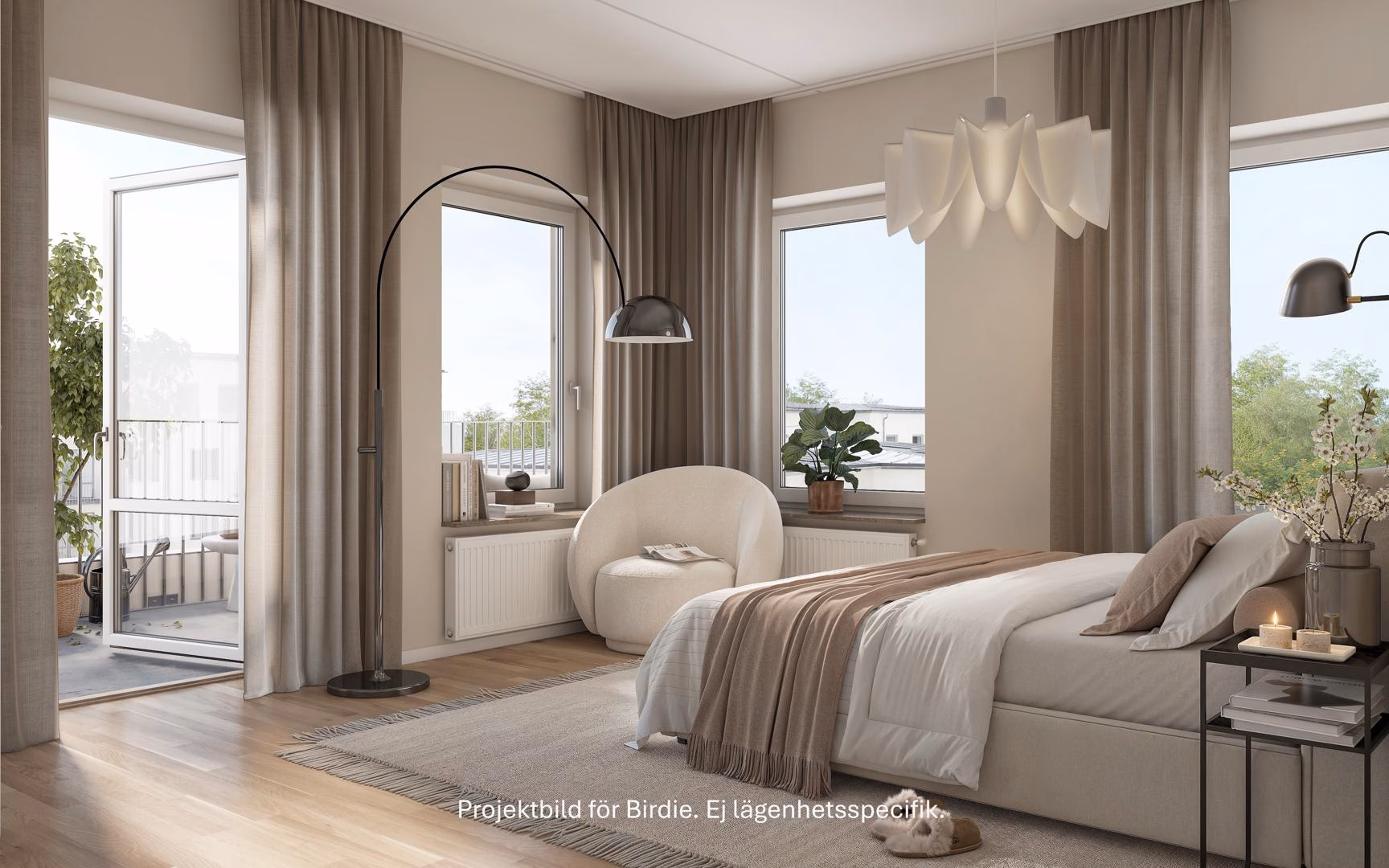 Välplanerad och ljus hörnlägenhet med balkong i sydvästläge. Förutom kök och vardagsrum med öppen planlösning har lägenheten två sovrum, snyggt och välutrustat badrum och en separat gäst-wc.