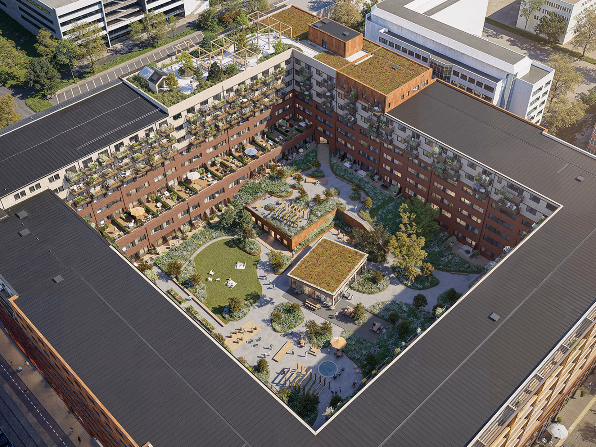 I en av Sveriges mest innovativa stadsdelar, växer en dynamisk och levande miljö fram. Precis som ett kretskort där impulser rör sig genom ett nätverk av noder, utgår energin från en central punkt, nämligen Square Garden. Denna huskropp blir navet där människor möts, idéer föds och livet får pulsera ut i alla riktningar. Här förenas storstadens rytm med grönskande lugn, det lokala med det globala, och skapar en plats där framtiden kopplas samman med vardagen.