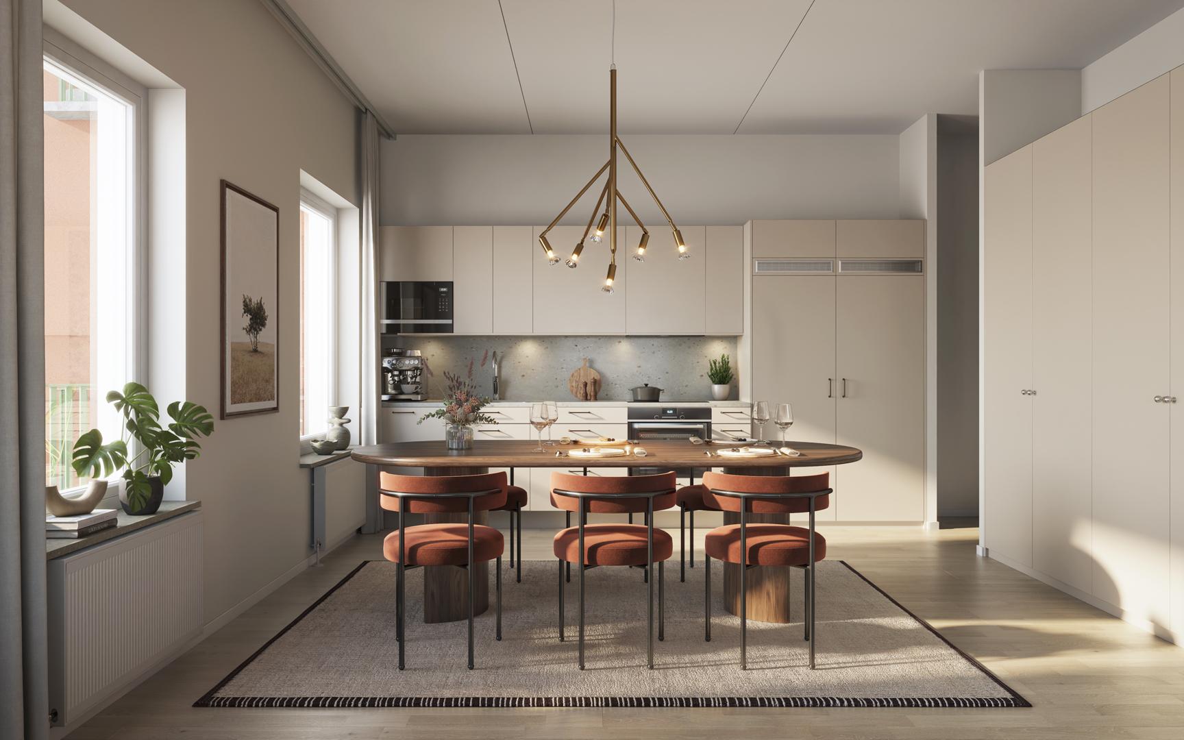 Köket i Viridum är utformat för att vara en harmonisk kombination av design och funktionalitet. Den ljusa ekparketten möter skåpsluckor i en varm, sandig ton med stilrena och diskreta handtag som förstärker den tidlösa känslan. Bänkskivan och stänkskyddet är i ett hållbart laminat med en kalkstensinspirerad finish som knyter samman kökets naturliga färgpalett och skapar en rofylld atmosfär.