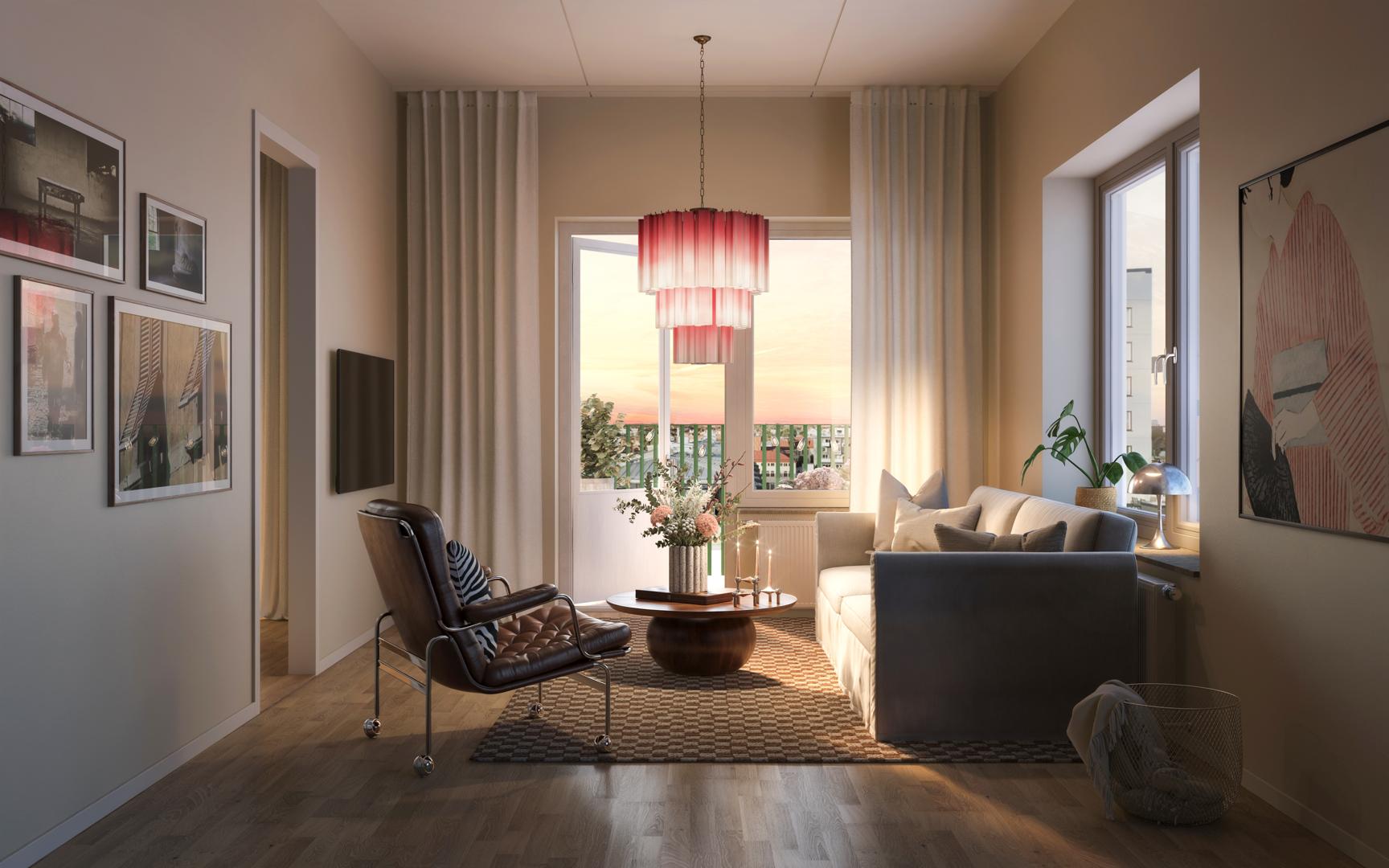 Högt upp i huset ligger denna ljusa gavellägenhet. Öppen planlösning mellan kök och vardagsrum samt balkong. Rymligt badrum med kombimaskin.