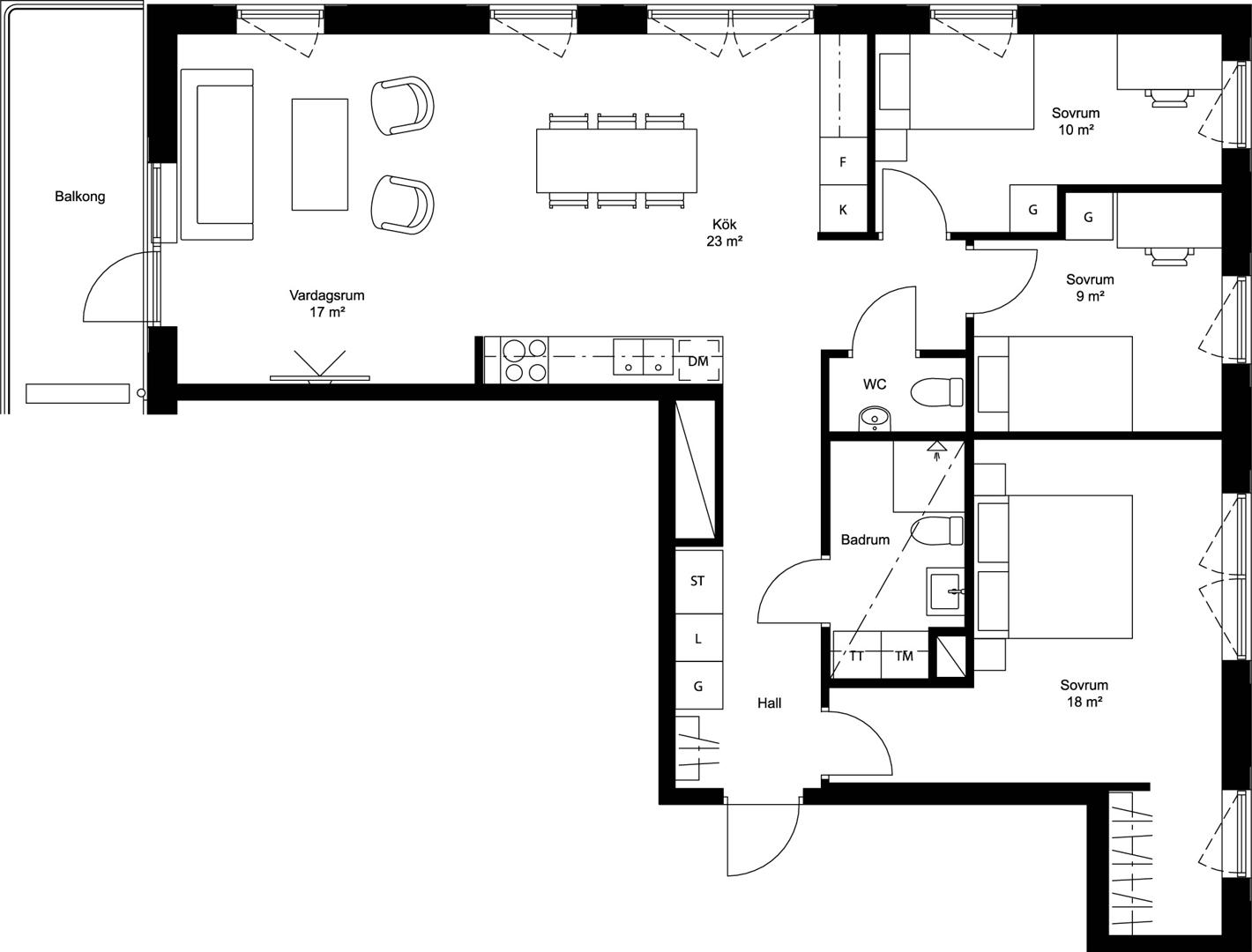 Välplanerad fyra med gavelläge och fönster i två väderstreck. Öppen planlösning mellan kök och vardagsrum och här ifrån når du lägenhetens balkong i söderläge.