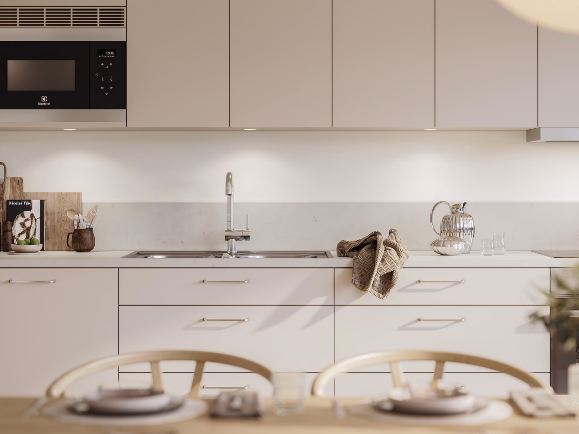 Lägenheterna är ljusa, öppna och noggrant planerade. Vardagsrum och kök bildar sociala ytor med stora fönster och gott om dagsljus. Många hem har dubbla balkonger och utsikt mot vattnet. Materialen är hållbara, detaljerna valda med omsorg och planeringen fokuserad på det som förenklar vardagen. Ett hem som håller, över tid och genom livets skiften.