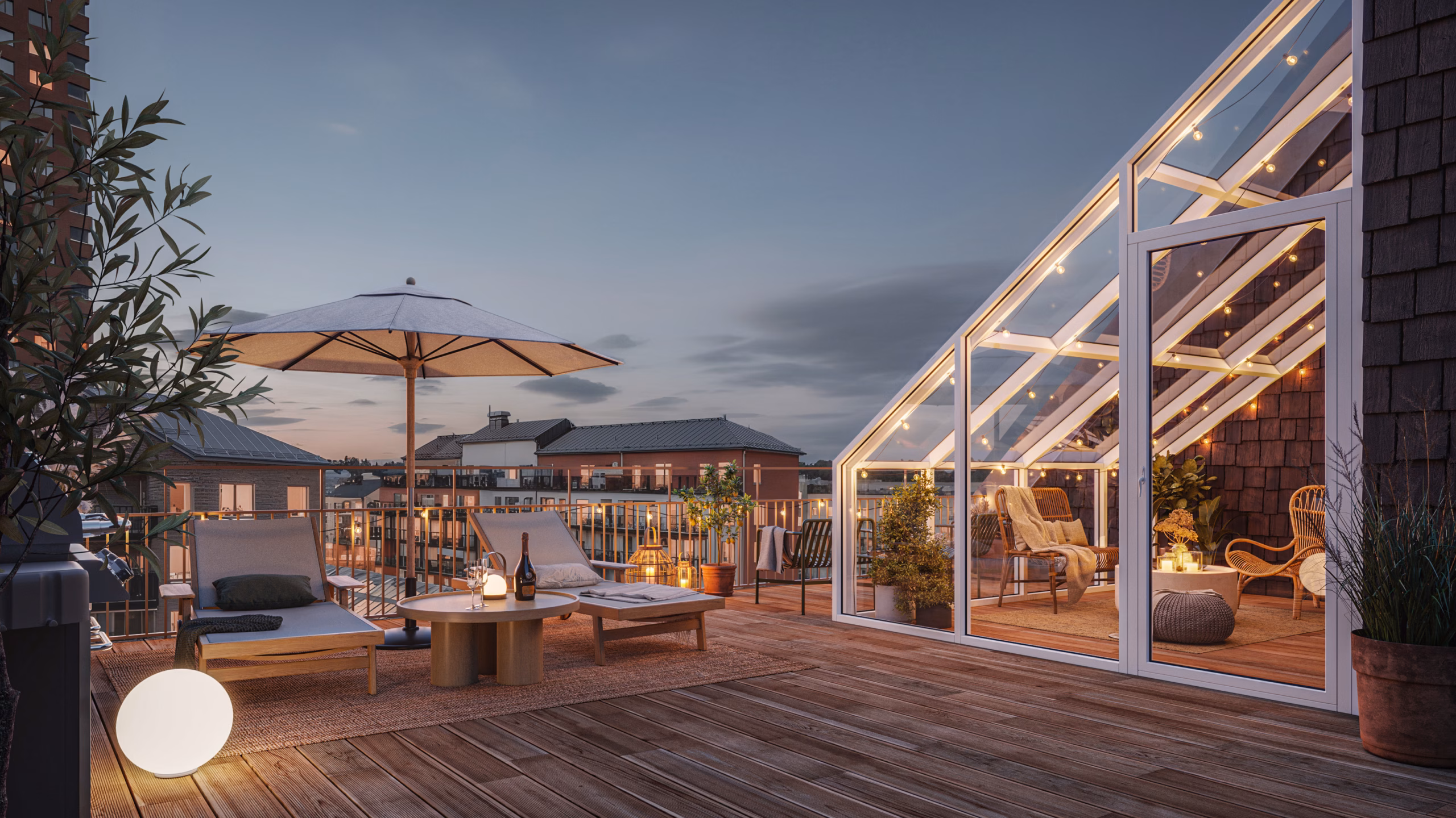 Titta in i en av våra exklusiva vindsvåningar med eget växthus och takterrass (Lgh B1401)