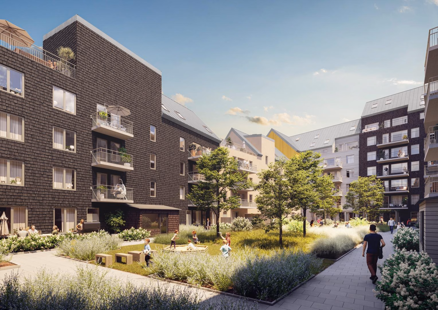 Bostäderna i Agora präglas av en harmonisk mix av ljusa färger och naturnära material.