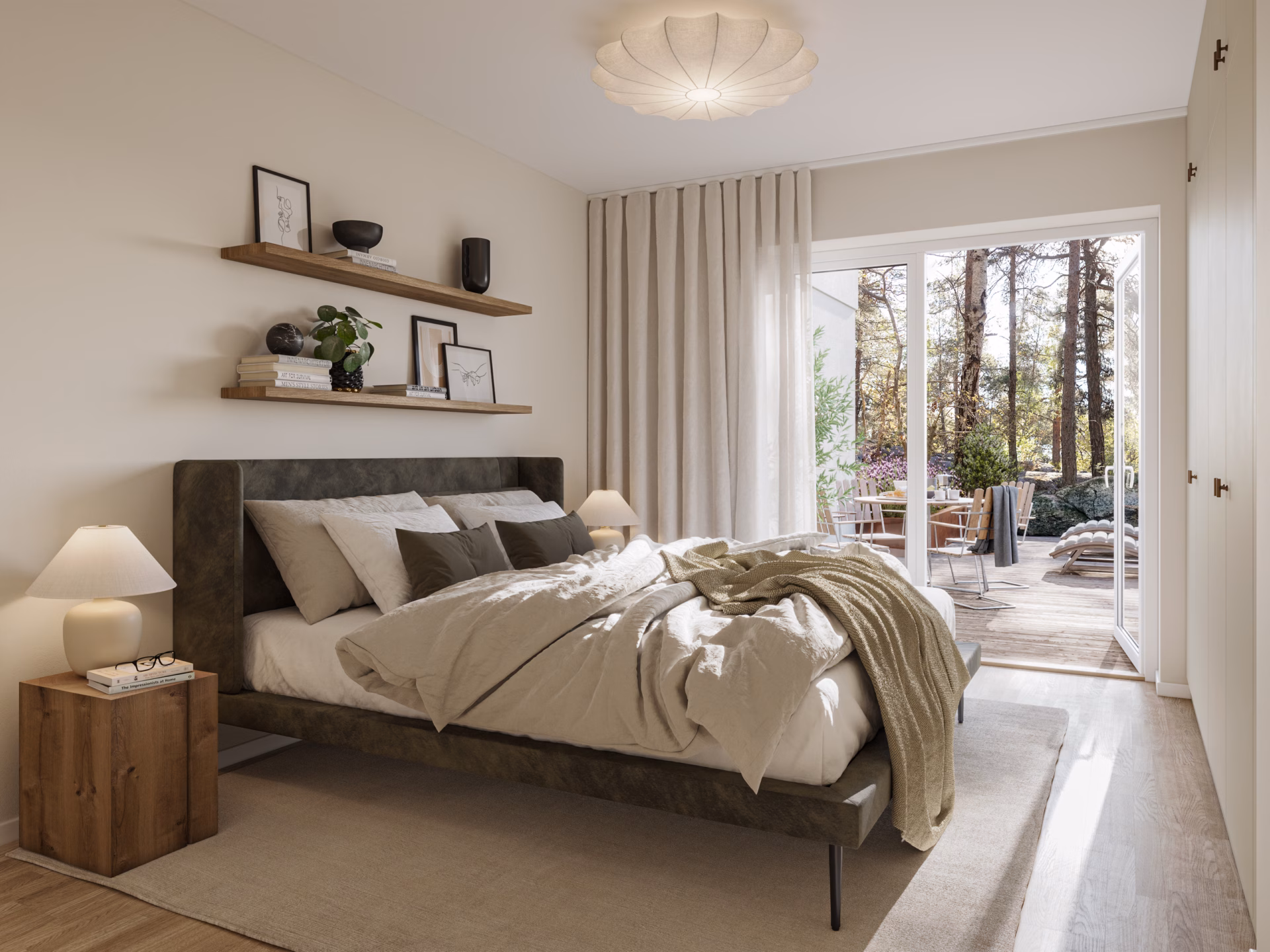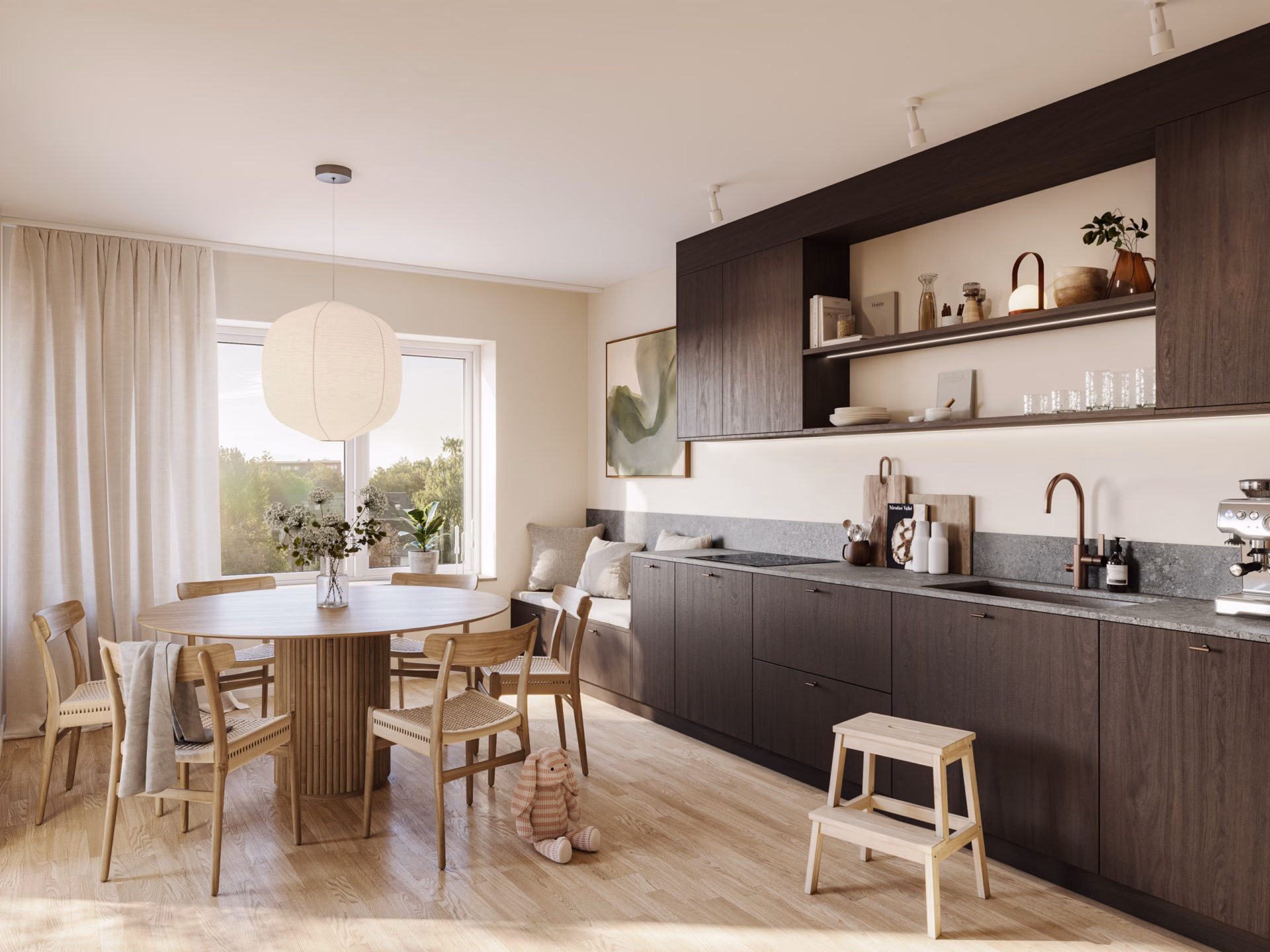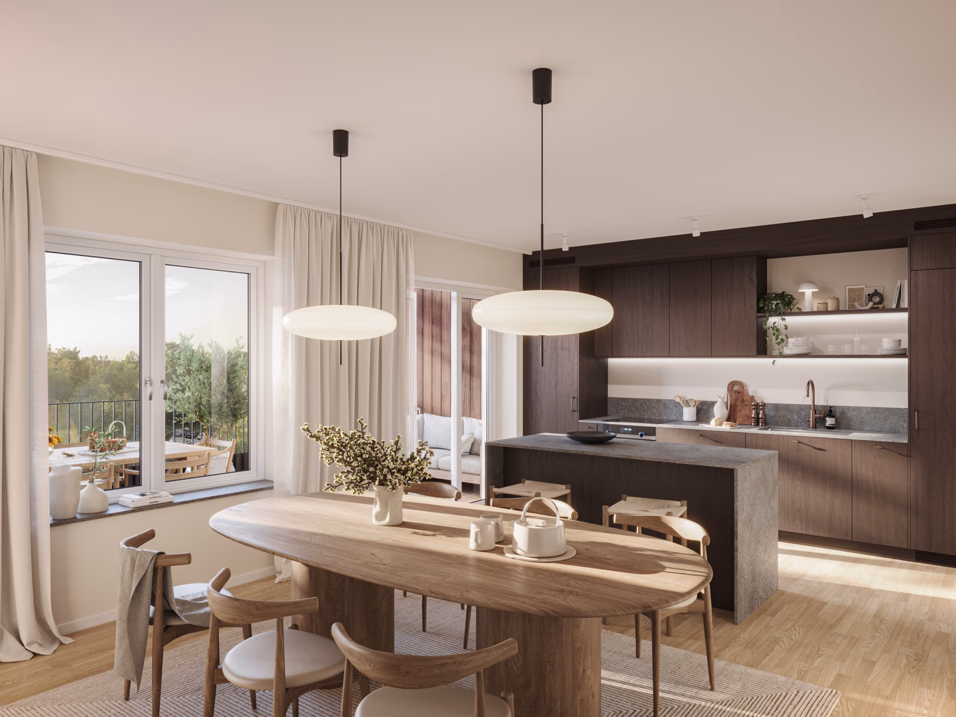 Materialen är noggrant utvalda i naturliga, tidlösa toner, för ett hem som håller över tid. Det fria läget ger bostäderna ett generöst ljusinsläpp, samtidigt som insynen är begränsad.