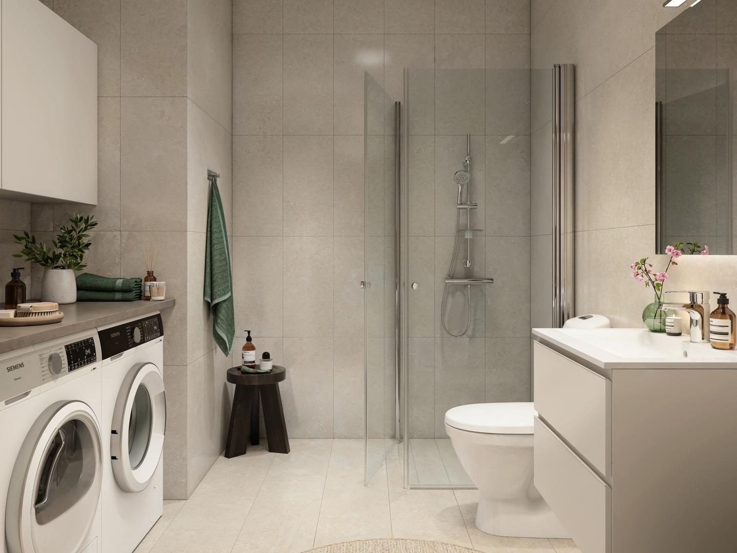 I Ture allé har vi skapat moderna badrum där stora, sandfärgade kakel- och klinkerplattor tillsammans med duschväggar i klarglas ger en känsla av lyx och harmoni. Tvättställskommoderna går ton i ton med kaklet och har en diskret grepplist och dubbla lådor med gott om förvaringsmöjligheter. Samtidigt är badrummen funktionellt planerade med bänkskiva och förvaringsskåp ovanför tvättmaskin och tumlare. Mindre lägenheter har kombimaskin med ovanliggande bänkskiva.