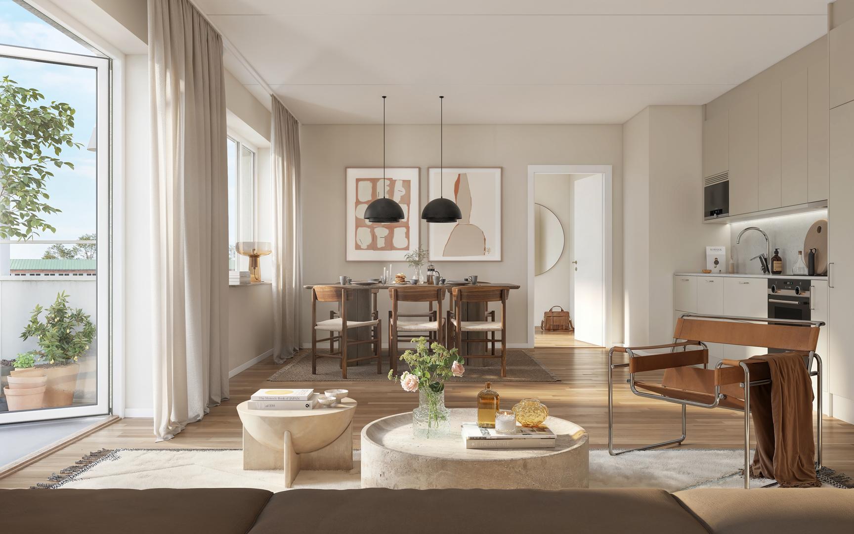 Bostäderna i Ture allé präglas av en harmonisk mix av ljusa färger och naturnära material. Samtliga väggar målas i en ljus och varm, gråbeige nyans och på golvet ligger en vitpigmenterad ekparkett.