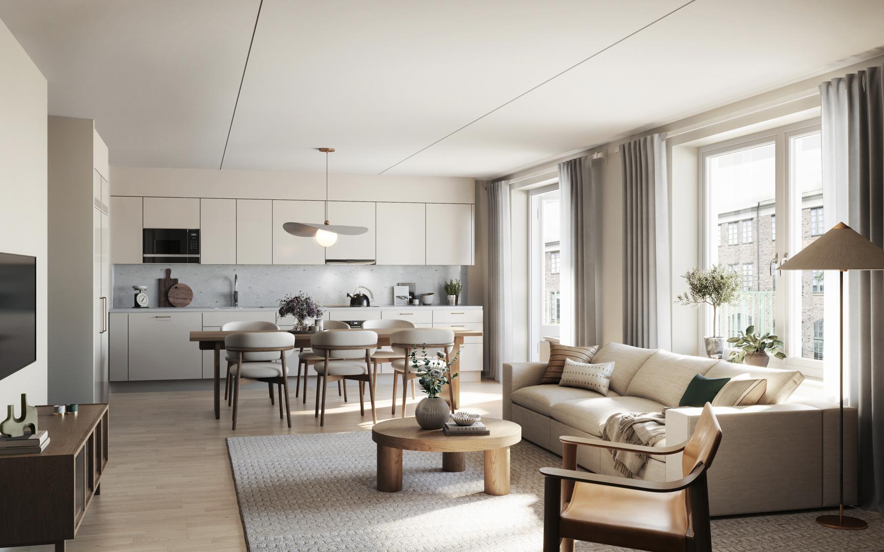 Köket i Viridum är utformat för att vara en harmonisk kombination av design och funktionalitet. Den ljusa ekparketten möter skåpsluckor i en varm, sandig ton med stilrena och diskreta handtag som förstärker den tidlösa känslan. Bänkskivan och stänkskyddet är i ett hållbart laminat med en kalkstensinspirerad finish som knyter samman kökets naturliga färgpalett och skapar en rofylld atmosfär.