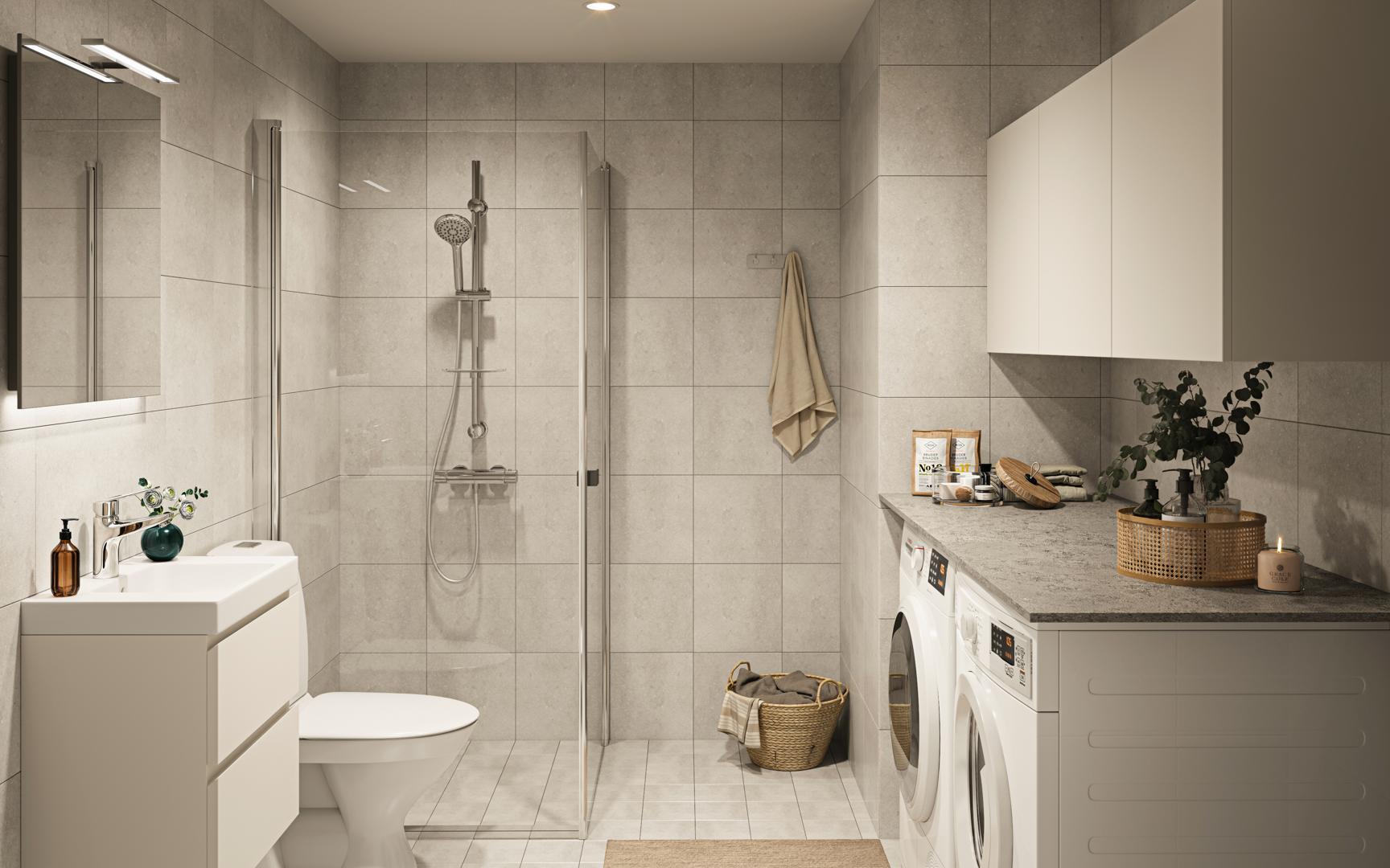 Här har vi tänkt på detaljerna som gör skillnad. Med praktiska lösningar som exempelvis en bänk - skiva och förvaringsskåp ovanför tvättmaskin och torktumlare – eller en kombimaskin i mindre lägenheter – är badrummet lika funktionellt som vackert. Det är ett rum där du kan börja och avsluta dagen med en känsla av ro och kvalitet.